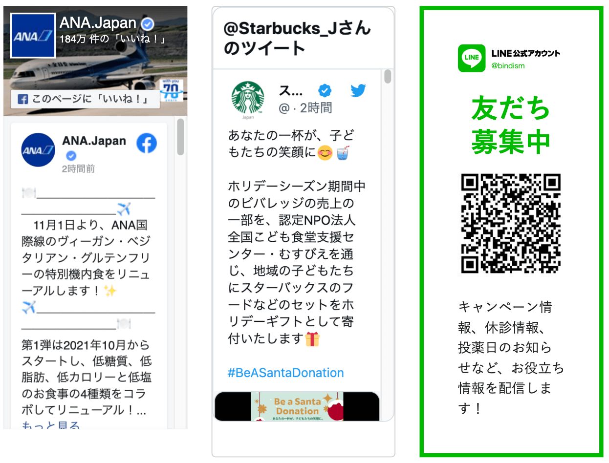 facebook、Twitter、LINEの3つを並べたブロック