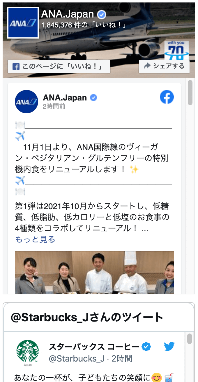 facebookのプラグインも、Twitter(publish.twitter.com利用)も広い幅で1カラムに配置するのは難しいので、分割したカラムに配置していくことが多くなると思います。