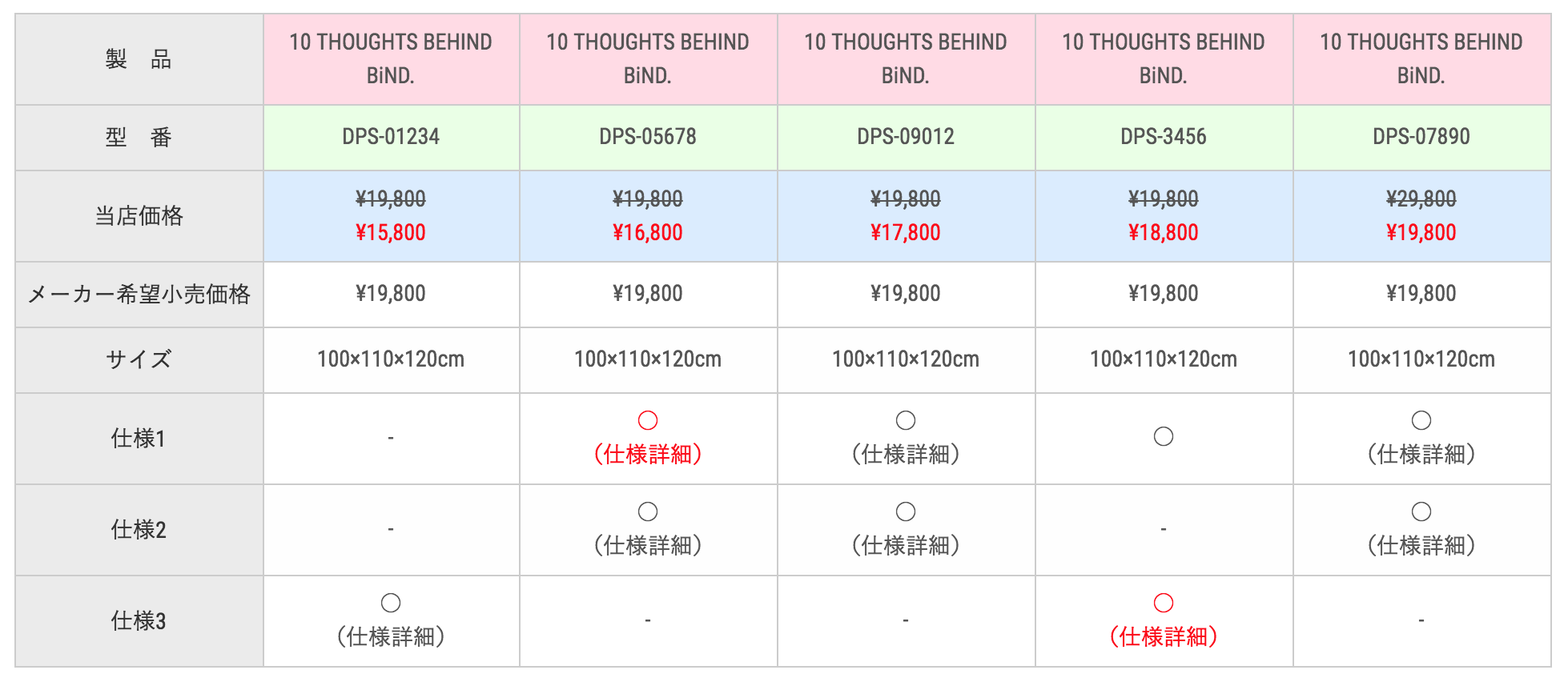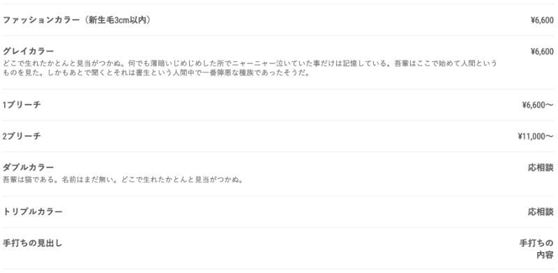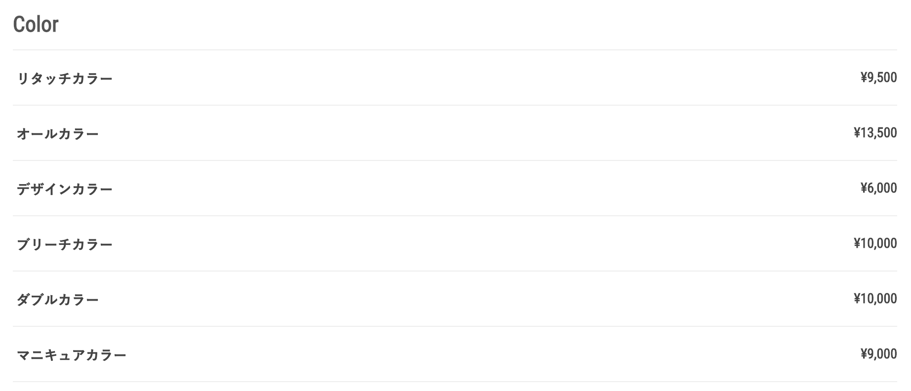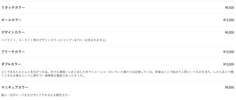 リスト・テーブル式での見え方をDRESSで設定し、料金表などの利用を想定したブロックデザイン。