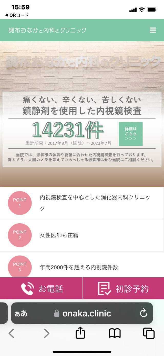 右は「調布 クリニック」で検索した時に地図検索の一番上に表示された「調布おなかと内科のクリニック」さんのサイトのスマホビューです。画面下に「お電話」「初診予約」というボタンがあります。