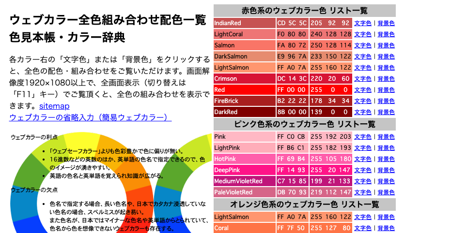 背景に設定する薄い色を探している時にオススメ!「白色系のウェブカラー色」の色から『背景色』をクリックするとその色がページの背景に設定されます。
